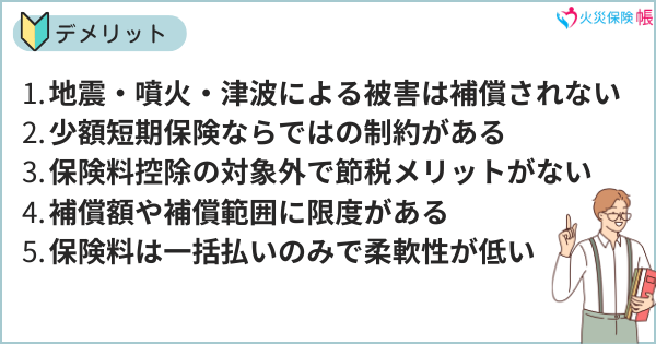 イオン少額短期保険のデメリットを整理すると、地震・噴火・津波が補償されない、保険料控除の対象外、分割払い不可、契約者保護機構の対象外、補償額に上限があるという点が重要です。これらはすべて、加入後に「思っていた内容と違った」と感じやすい部分でもあります。
