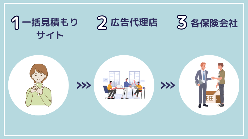 入力した情報が保険会社や保険代理店に提供され、保険会社や保険代理店が見積書を作成します。このとき火災保険比較サイトがまとめて送ってくるケースと、それぞれ個別に見積書が送られてくるケースがあります。