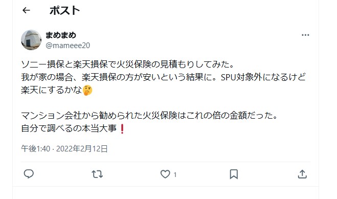 大手損害保険会社はもちろん、他のカスタマイズ型の火災保険と比べても圧倒的に保険料が安いこと。新築物件の場合、新築割の適用で少し差が縮まりますが、築年数が経つ物件になるとその差がより顕著になります。口コミ